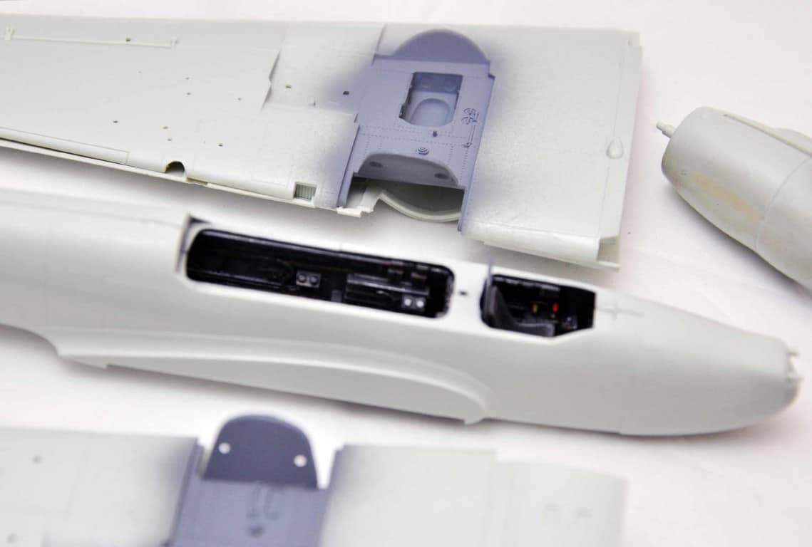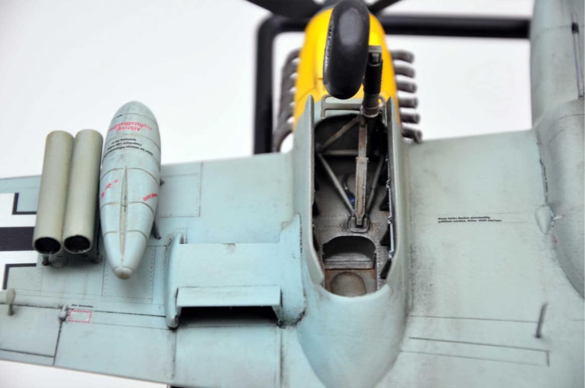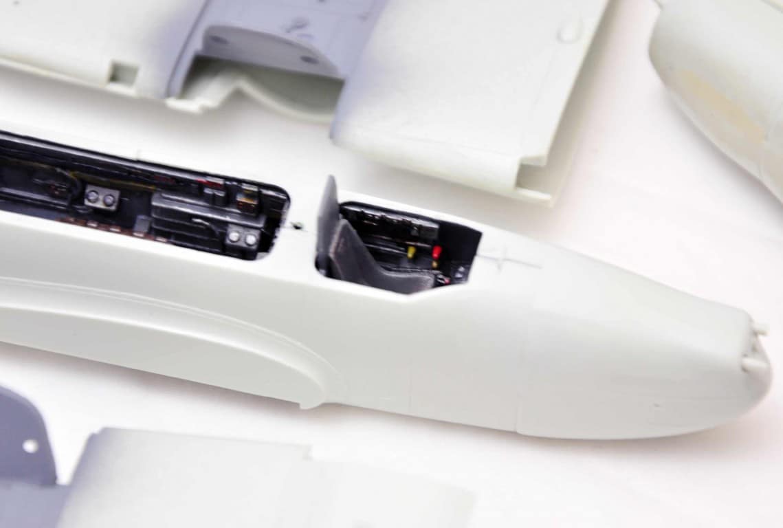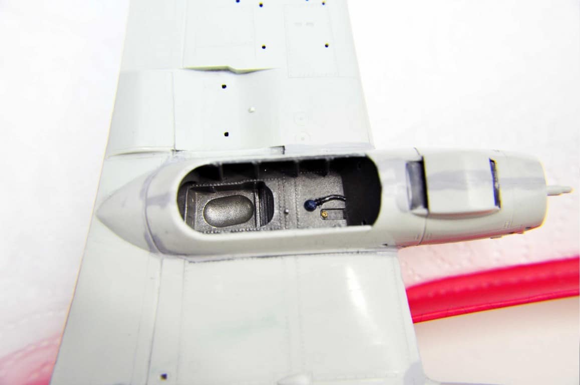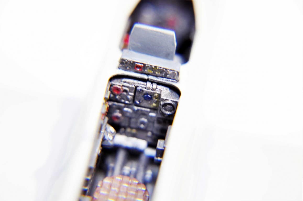 Następnym etapem budowy modelu jest kokpit. Lubię i jednocześnie nie lubię – dlatego że lubię grzebać w detalach (pędzelek rozmiar 000, wykałaczka, blaszki, wash) ale nie mogę jednocześnie doczekać się poskładania całej bryły i już malowania (po wcześniejszym podkładowaniu). Na tym etapie idą w ruch pierwsze psiknięcia aerografem – szczególnie wew. ścianki kokpitu, komory podwozia, luków.