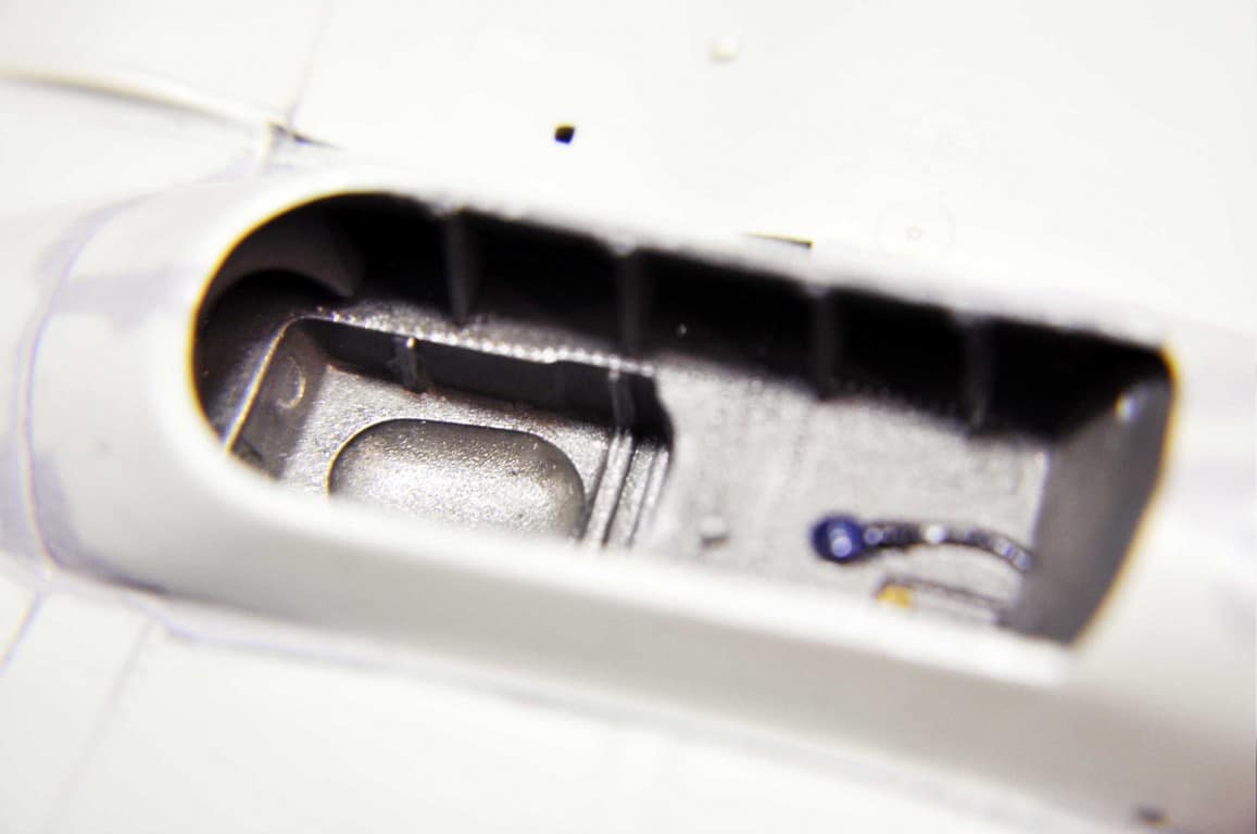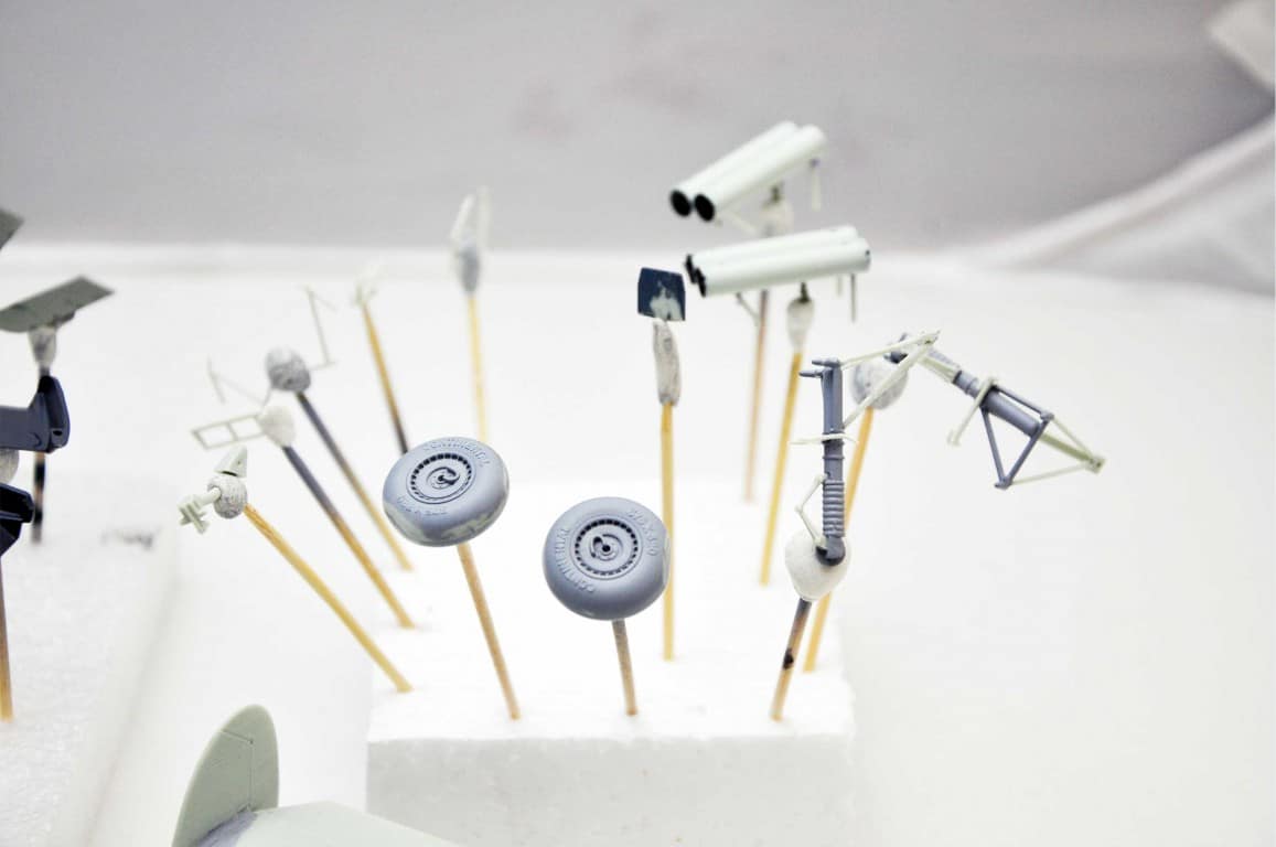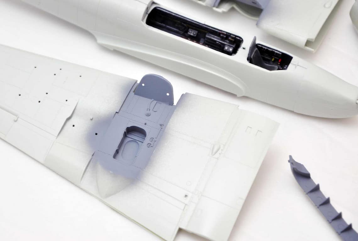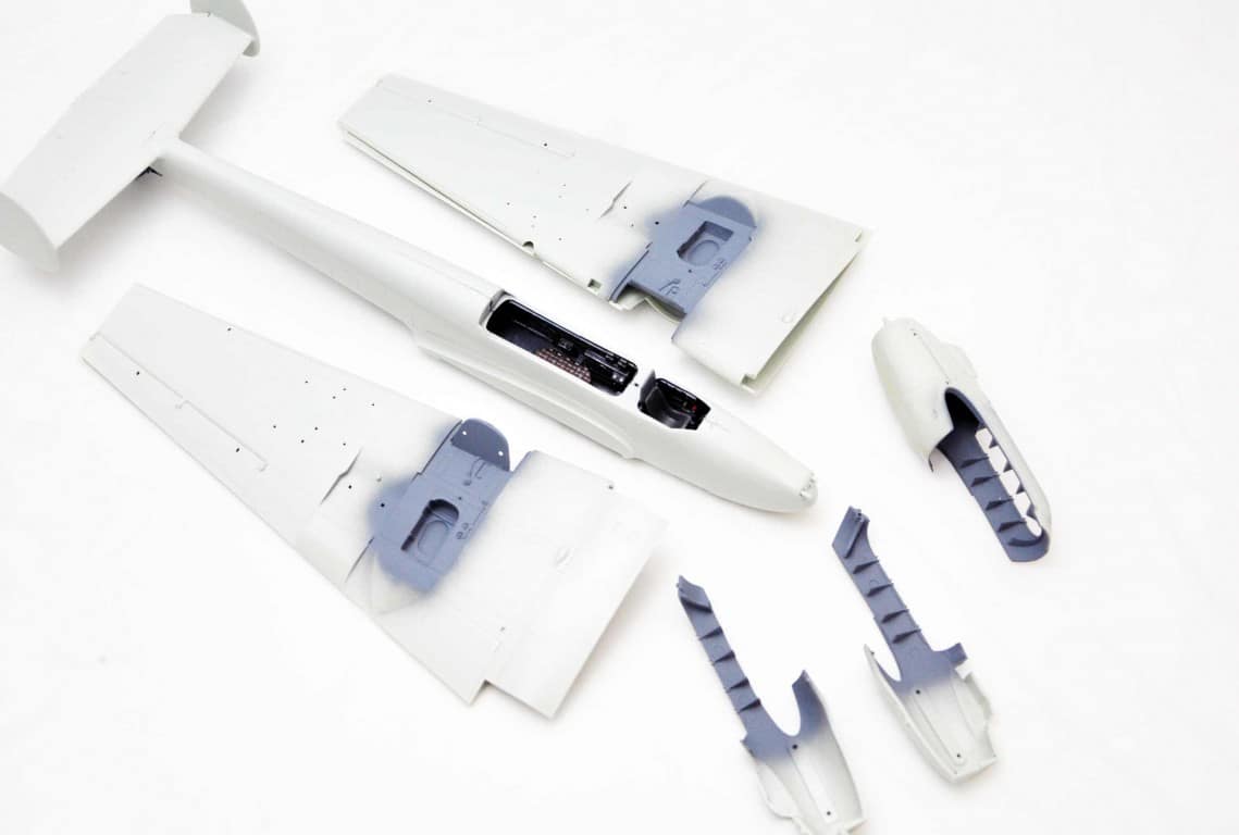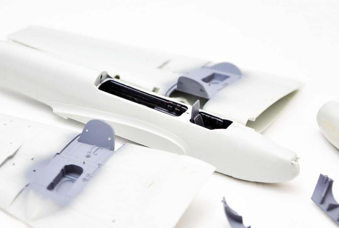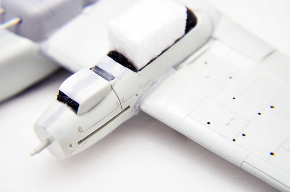 Następnym etapem budowy modelu jest kokpit. Lubię i jednocześnie nie lubię – dlatego że lubię grzebać w detalach (pędzelek rozmiar 000, wykałaczka, blaszki, wash) ale nie mogę jednocześnie doczekać się poskładania całej bryły i już malowania (po wcześniejszym podkładowaniu). Na tym etapie idą w ruch pierwsze psiknięcia aerografem – szczególnie wew. ścianki kokpitu, komory podwozia, luków.