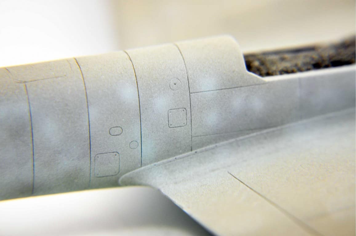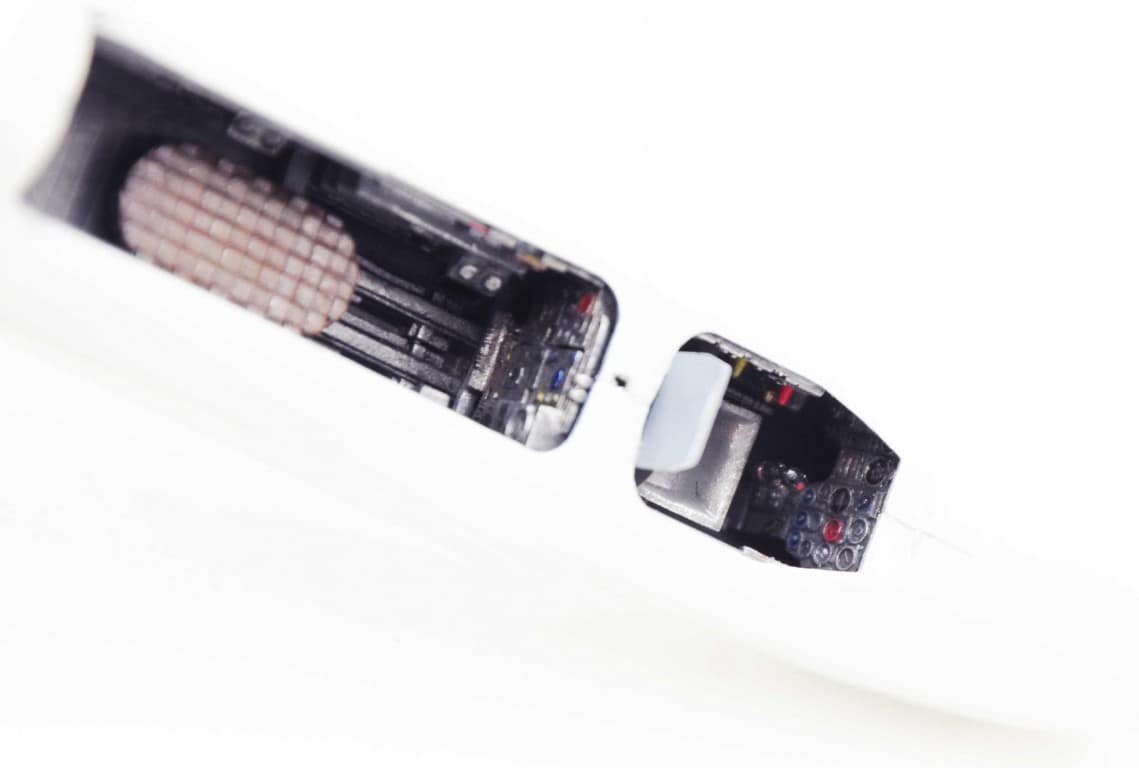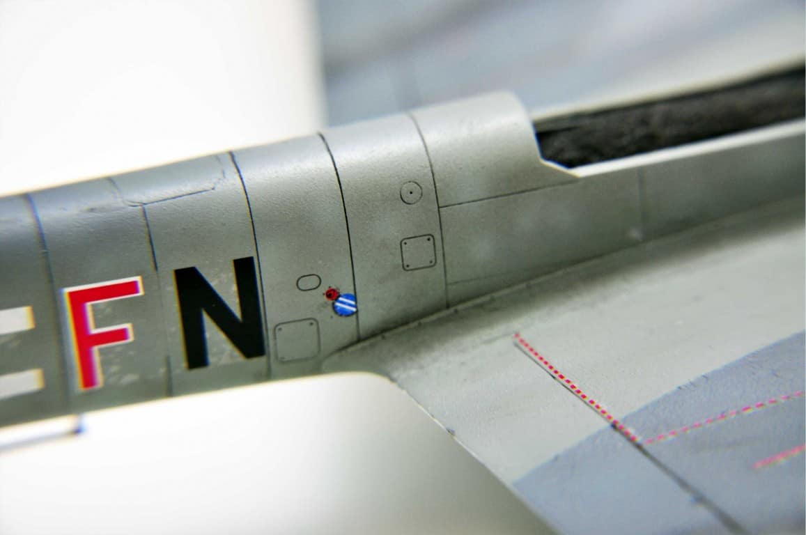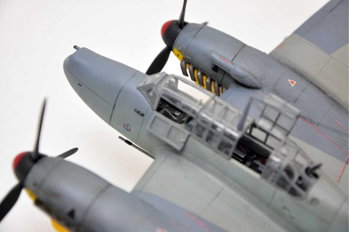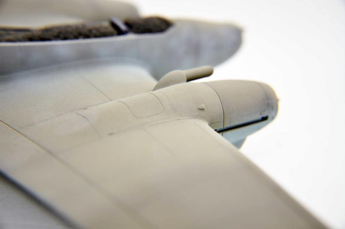 Następnym etapem budowy modelu jest kokpit. Lubię i jednocześnie nie lubię – dlatego że lubię grzebać w detalach (pędzelek rozmiar 000, wykałaczka, blaszki, wash) ale nie mogę jednocześnie doczekać się poskładania całej bryły i już malowania (po wcześniejszym podkładowaniu). Na tym etapie idą w ruch pierwsze psiknięcia aerografem – szczególnie wew. ścianki kokpitu, komory podwozia, luków.