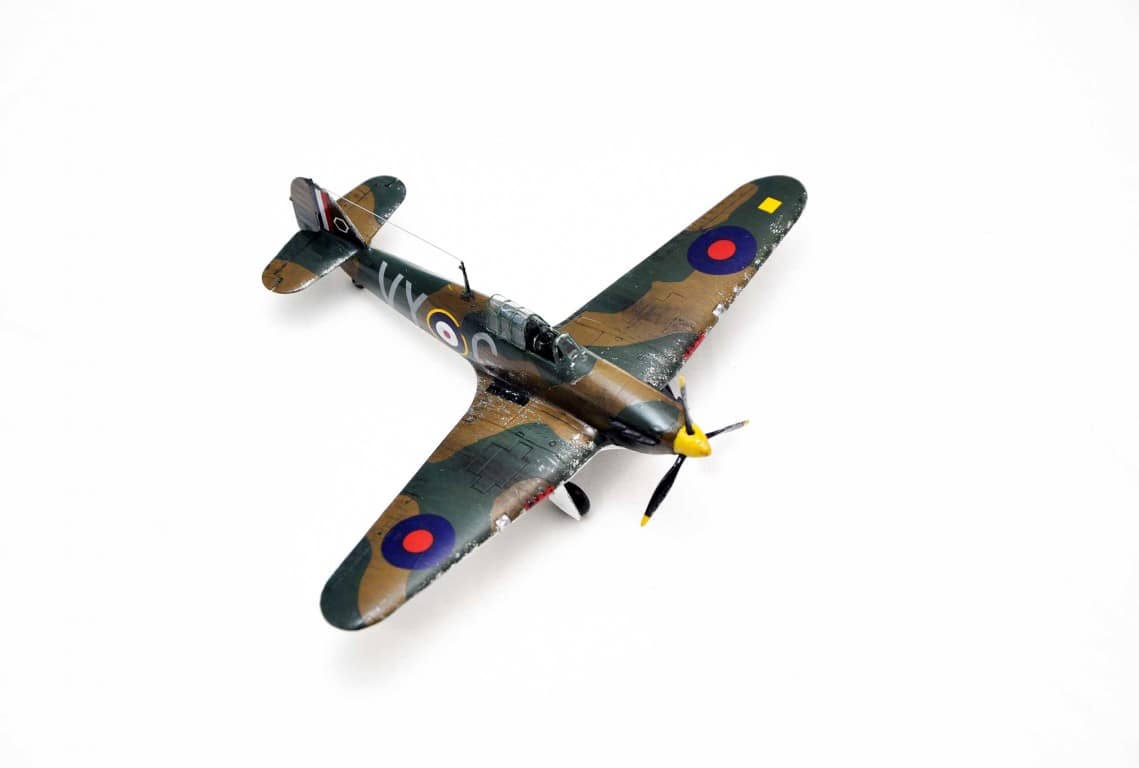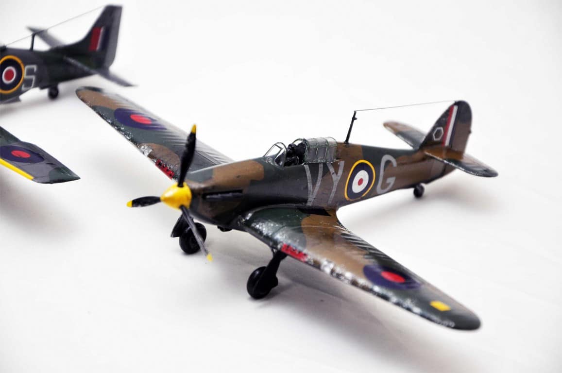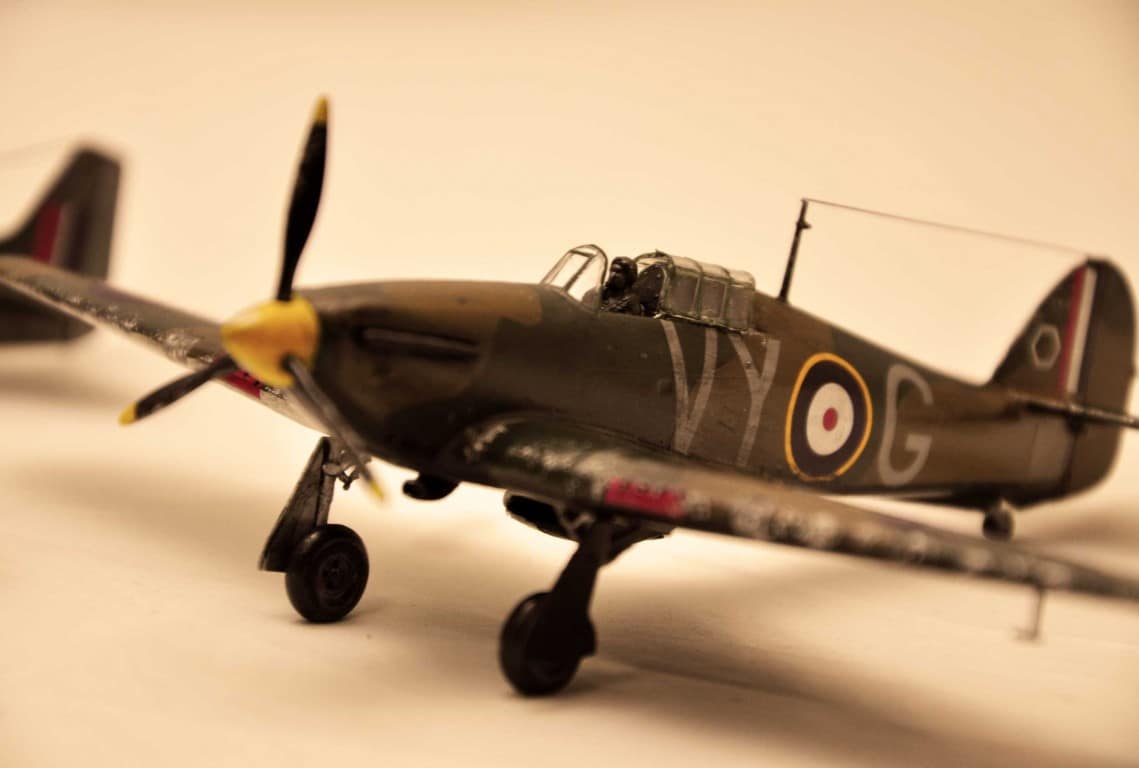 Tak naprawdę zawsze działałem w kartonie. Mały Modelarz, FlyModel, Haliński, inne. Ostatnie lata zajmowałem się głownie modelami zdalnie sterowanymi RC. Przyszła jednak chęć na plastik, w który w sumie na porządnie wciągam się teraz. Hawkera pomalowaliśmy farbkami Humbrola – dokupiliśmy więcej niż w starterze. Tutaj zastosowaliśmy już podkład Tamiya w spray`juuu, szpachlowanie, szlifowanie, itd. Dalej było już tylko gorzej. Bruzdy, za grube warstwy, za dużo lakieru, zły wash. Wszystko źle i nie tak – ale dał sporo nauki. Kolejne idą lepiej (: